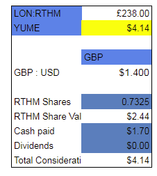 Let’s start with how things played out. The tender / merger closed in early February. RTHM’s shares traded at ~£265 when the deal closed and, as I write this, RTHM shares are trading at £238, so YUME shareholder got somewhere between $4.14/share (using today’s RTHM share price) to $4.40/share (using RTHM’s closing share price at deal completion). I’ll come back to this point when we discuss trading dynamic but wanted to just quickly summarize how things played out.