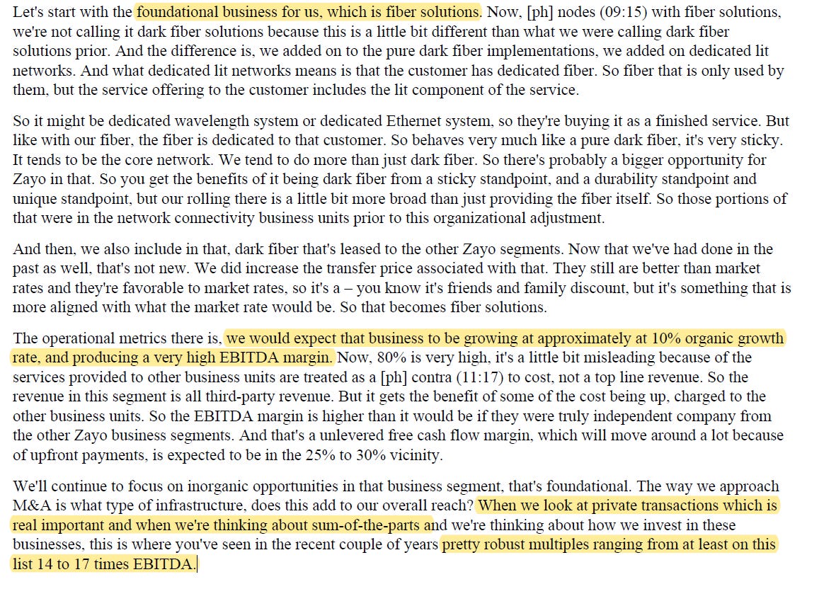 I didn't talk a lot about the spin off in the write up because I'm pretty sure Zayo is getting sold. If it's not sold and the spin-off ends up happening, I'm pretty meh on the spin plan. On one hand, the spin will let them get the "good" infrastructure assets into a REIT structure in the near future, and the good infra company which will likely trade at a very strong multiple and perhaps give a bit more visibility into the underlying value of Zayo. On the other hand, the spin seems pretty operationally complex. The two businesses are connected to each other and will need to be governed by what seem like pretty complex intra-company agreements; in general, spins work best when two businesses can be cleanly split from each other and that doesn't seem to be the case here, and it doesn't lend a lot of credence to the spin plan that it seems like private equity would prefer the whole company be kept together (as the reporting on a potential deal suggests, and note that private equity bought Lumos whole instead of split up a few years ago). Reasonable people can disagree though; I've had several people smarter than me tell me the spin is a good thing just because it gets the infrastructure side to where it needs to be (a REIT).