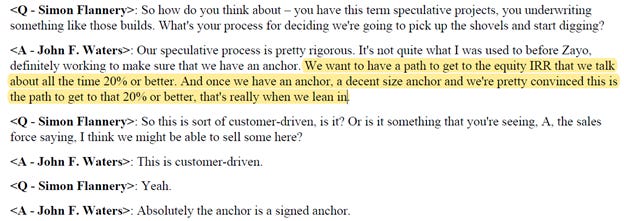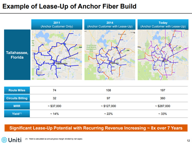 Again, I'm not saying these are perfect comps (and I doubt Fiber is going for the $150k/route mile average value mentioned above!), but I am just using this as a sanity check. I would not be shocked to see Zayo's Fiber trade for a premium multiple to where those comps were traded for two reasons. First, it's tough to know the value of fiber without looking under the hood (i.e. seeing exactly where all the fiber is, how dense it is, and the customer demand in those locations), but Zayo consistently suggests that their fiber is among the deepest / densest / most unique in the industry (here's one more quote for good measure). I always take a company's view of their own asset value with a grain of salt or three, but my understanding based on reading up on the industry / listening to competitors seems to suggest that Zayo's base is of at least above average quality. Second, those acquisitions were generally of "bolt on" size. Zayo is much bigger than those deal comps, so a buyer could look at Zayo as a "platform" that they could use to roll up a still very fragmented industry. That makes a difference for, say, a private equity / infrastructure fund looking to get into the space and deploy capital at an attractive ROI. Say fair value for fiber assets is 15x: if you're a private equity company, you need to pay less than fair value so you can get a juicy IRR for your fund.... but you could convince yourself to pay 15x (i.e. full and fair value) for the "platform" and then pay 12x for a bunch of bolt-ons that, after synergies, you'll effectively have bought for 8x. Double a company's size through those bolt ons and you'll have achieved a very nice IRR on a very large pot of money (important for giant funds looking to deploy all their dry powder! Also apparently the strategy EQT is pursuing at the company formerly known as Lumos.). Speaking of bolt on acquisitions, one of the really interesting things about Zayo (and any fiber asset in general) is the ability to leverage an initial fiber investment by adding new customers to an already built fiber line (note that this is not unique to Zayo; for example, AT&T talked about how they are using AI to improve their fiber build out ROI). That dynamic presents pretty interesting growth dynamics for Zayo; in general, when they lay a new fiber route, they have an anchor investor committed to the route that will allow them to already achieve an attractive ROI. If they can then sign up more customers to that route, the incremental cost is minimal and the ROI is huge. Below are two screenshots: the first is a quote from Zayo talking about how they think they can do 20% equity IRRs given this dynamic. The second is a screenshot from a UNIT investor presentation that I think does a really nice job of illustrating exactly how a fiber build out works and how strong the IRR can be. It's also interesting to think about that "anchor fiber buildout" dynamic in light of coming 5G investments (5G will require lots of new small cell, and the ability to quickly and easily hook up a small cell to an existing fiber branch should present huge incremental growth opportunities for fiber providers).