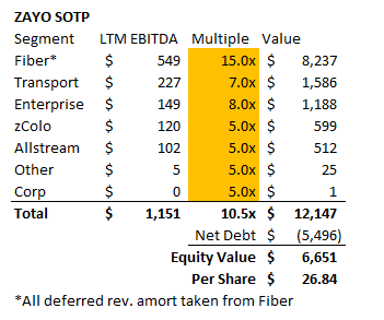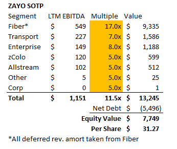 I'm saying Fiber is worth at least a mid-double digit EBITDA multiple, so these profitable growth opportunities are largely captured by the high valuation I've given Fiber (profitable reinvestment opportunties are generally baked into above average EBITDA multiples). Still, I highlight that anchor fiber buildout opportunity for two reasons. First, a lot of people will read "Fiber valued at 15x EBITDA" and get a bit of a nosebleed from the multiple, so I wanted to highlight (one reason) why the business deserves a high multiple. Second, it seems like Zayo is in talks to get bought by infrastructure private equity funds, and these type of high IRR reinvestment opportunities are catnip to infrastructure private equity funds (it lets them put more money to work, and given they'll use an aggressive debt structure they can do so at very high IRRs). Anyway, my bottom line is that Zayo's fiber segment is very valuable. My earlier SOTP used 15x LTM EBITDA but that's likely too conservative. Comps have generally traded for at least that level, and it appears Zayo's assets are both better on a standalone basis than those comps and offer more growth / platform potential than comps. If Fiber was worth 17x instead of 15x and all other segments were worth what I estimated them at earlier, Zayo would be worth ~$31/share.