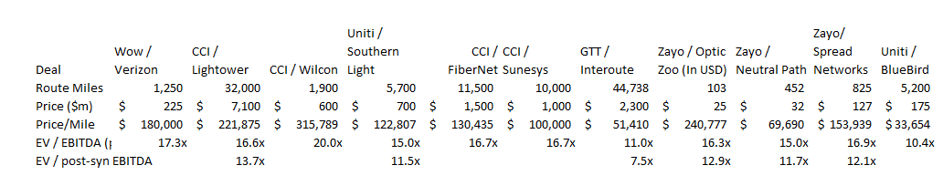 The big question is if that valuation makes sense, and I think it does. I tracked down 10 different "fiber" deals (Wow / Verizon, CCI / Lightower, CCI / Wilcon, Uniti / Southern Light, CCI / FiberNet, CCI / Sunesys, GTT / Interoute, Uniti / BlueBird, Zayo / Optic Zoo, Zayo / Neutral Path, and Zayo / Spread Networks); I'm sure there are plenty more fiber transactions and would be open to suggestions if you know of any. Below I've pasted the basic deal stats for those ten fiber deals (note that for some of these the numbers were not laid out perfectly, so I may have made some assumptions based on what was given in the PR but these should all be directionally correct).