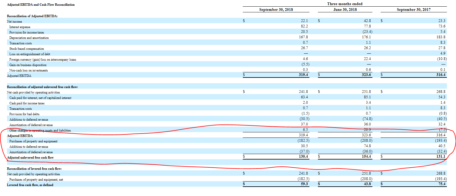 Fortunately for us, Zayo has provided us with suggested comps in the recent past. In March 2017, the company published an investor deck that walked through each segment and whole they thought the best comps would be. So we can simply take the LTM EBITDA for each segment, assign a multiple to it, and then figure out ZAYO's sum of the parts (SOTP) that way. Before we do that, a quick note. Zayo's EBITDA numbers probably deserve an asterisk or three as their adjusted EBITDA definition includes "amortization of deferred revenue". Amortization of revenue comes when a customer gives Zayo cash upfront; because Zayo can't immediately book that revenue, they set up a "deferred revenue" liability against that cash on their balance sheet and then slowly bleed that deferred revenue liability down as they recognize the revenue from the customer. Adding this amortization back inflates Zayo's EBITDA: Zayo took in the cash from this add-back months / years ago, so by adding that amortization back Zayo's adjusted EBITDA is higher than their "cash EBITDA." This add-back doesn't make a huge difference as long as Zayo is growing / adding to their deferred revenue account (so cash build from new deferred revenue offsets that add-back), but when valuing Zayo on a steady state basis it means the adjusted EBITDA number they present is probably too high.