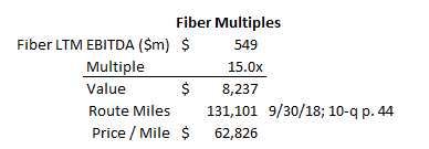 Are any of these perfect comps for Zayo's Fiber business? No. These are generally bolt on acquisitions, the price of fiber is very dependent on its quality (how dense it is, how attractive the region it's in is, etc.), and some of the deals have very specific quirks (Uniti / Bluebird, for example, has a headline price of ~10x EBTIDA but included the seller prepaying >5 years worth of rent, so the effective price is probably much higher, and the GTT / Interoute deal was a European deal (Europe makes up a small portion of Zayo's value)). So the table certainly has some serious limitations, but it does serve as a nice starting point for thinking about value. On average, the pre-synergy multiple paid for Fiber is ~15.6x (16.7x if we takeout out Uniti and GTT, which are the least comparable), and the average price per route mile is approaching $150k. The SOTP I used above valued fiber at 15x LTM EBITDA and ~$63k/route mile, so I don't think it's a crazy valuation by any stretch.
